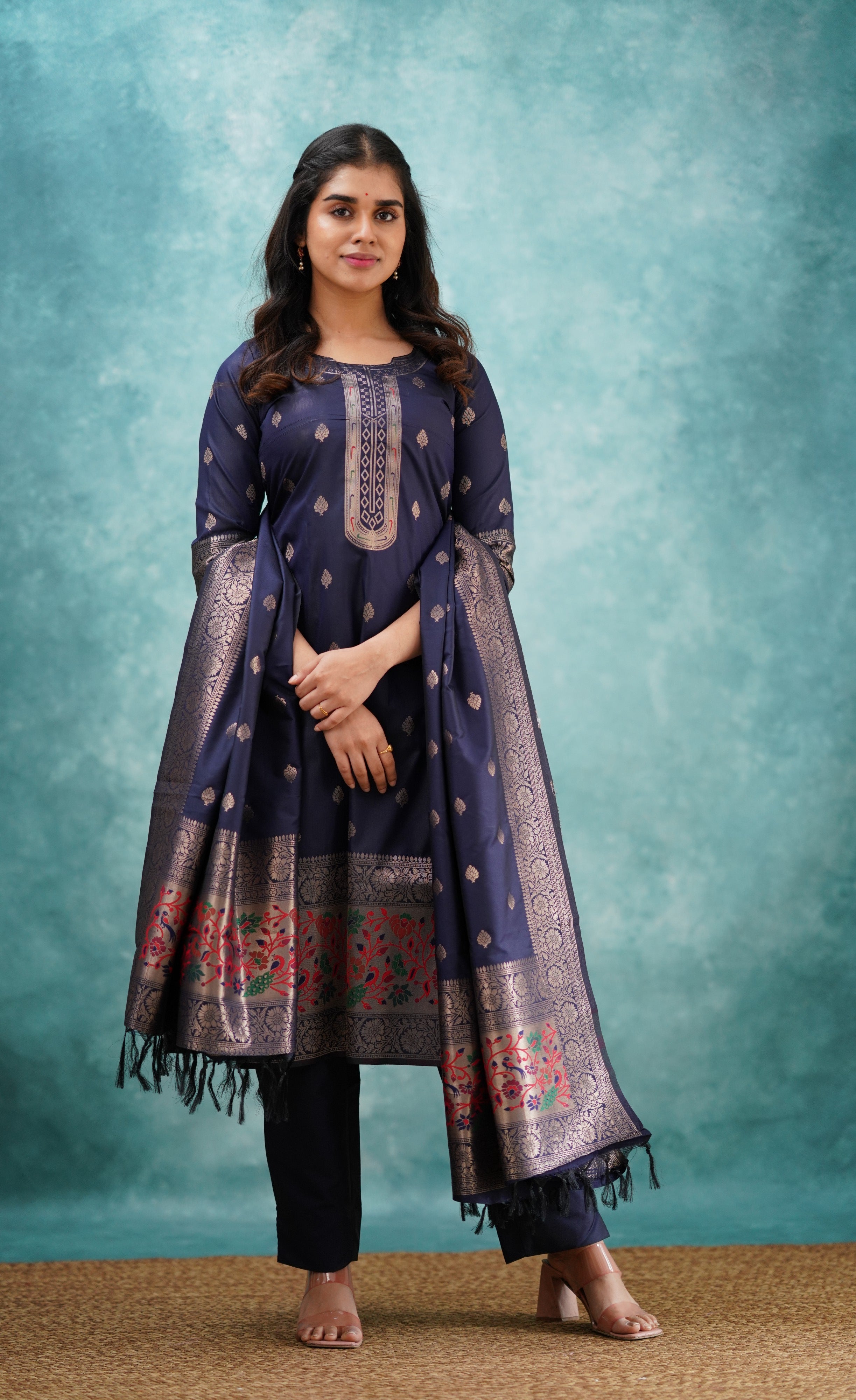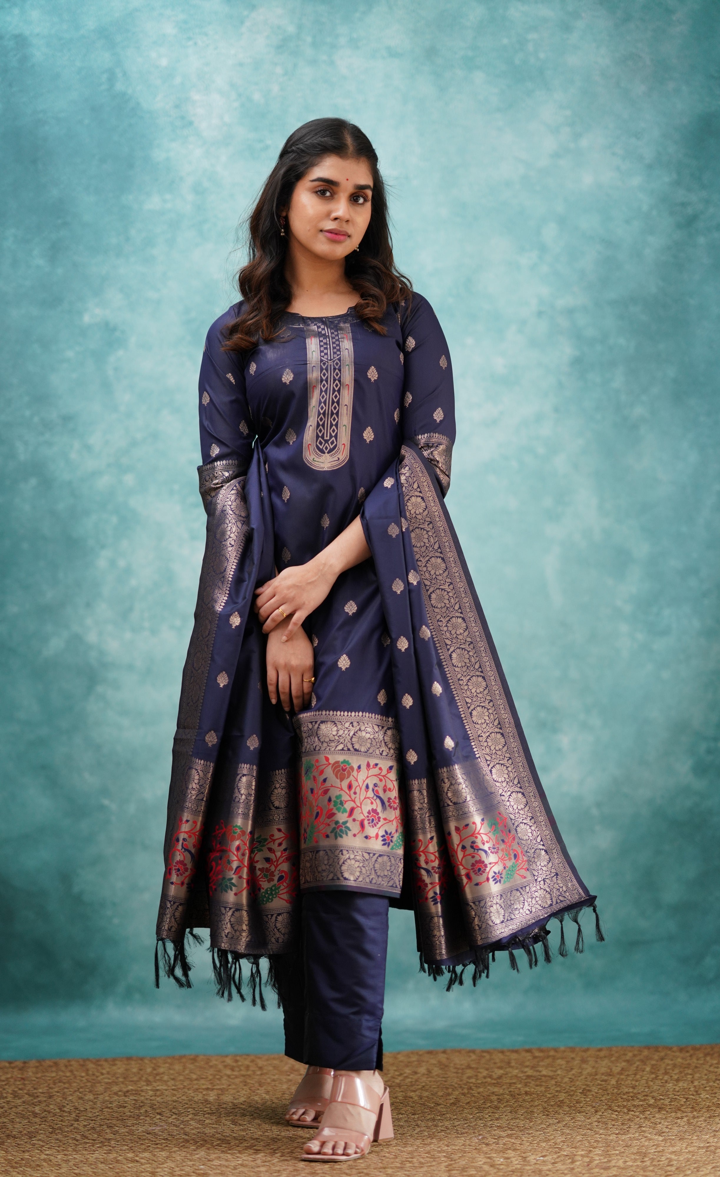 Sanvi - Navy Blue Blended Paithani Silk Salwar Plus Size