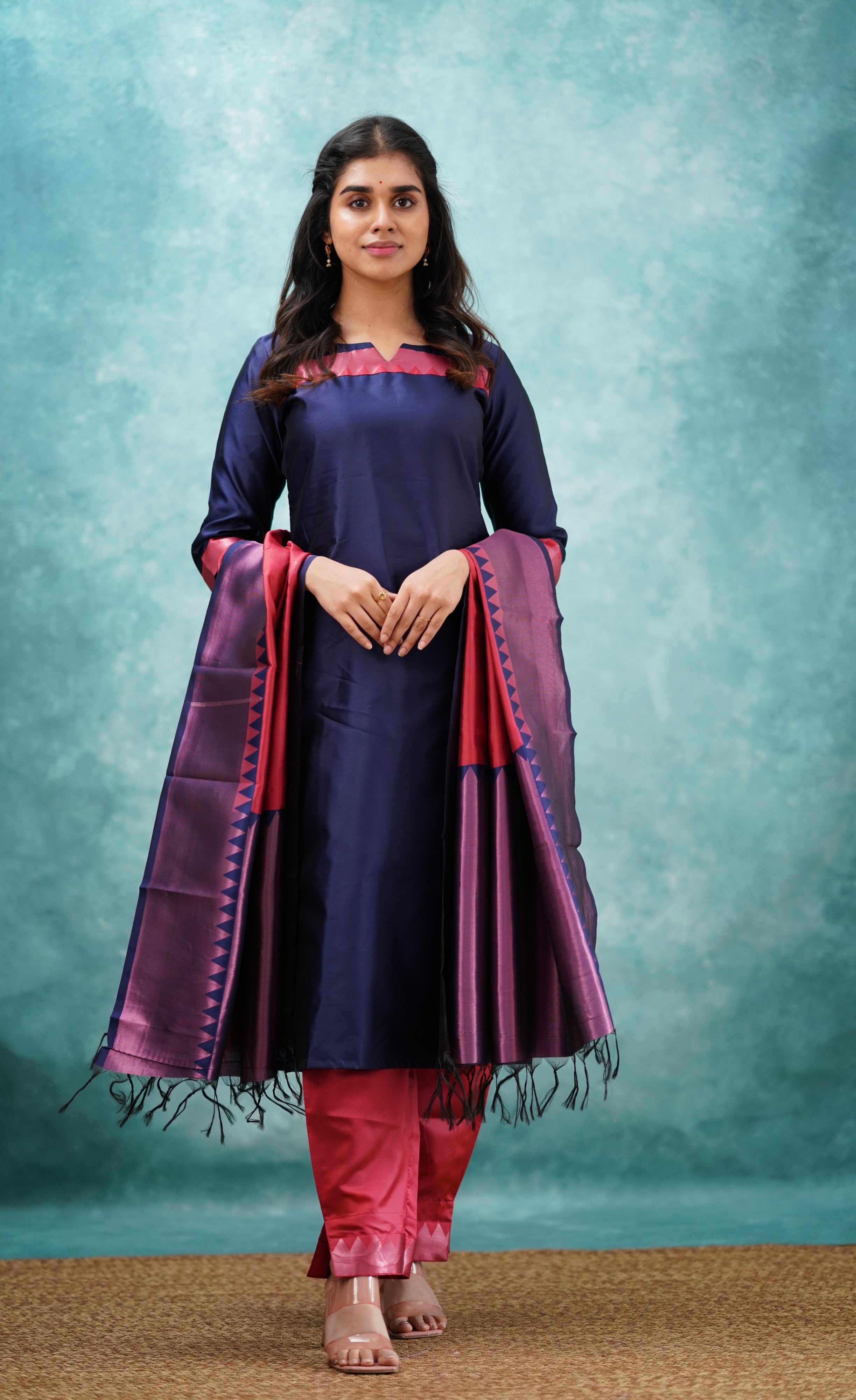 Sanvi - Dark Blue and Red Semi Kanchipuram Silk Salwar Plus Size