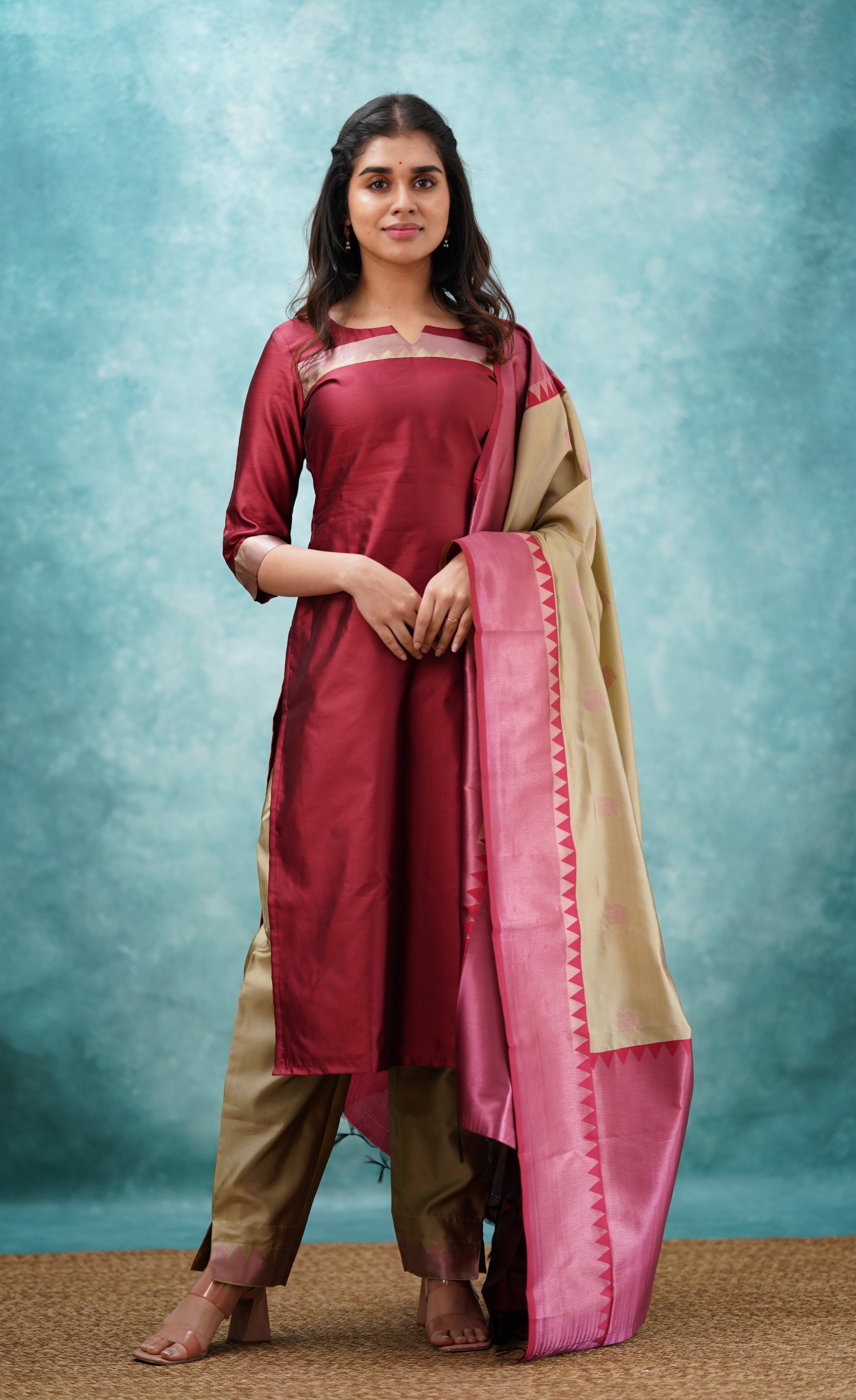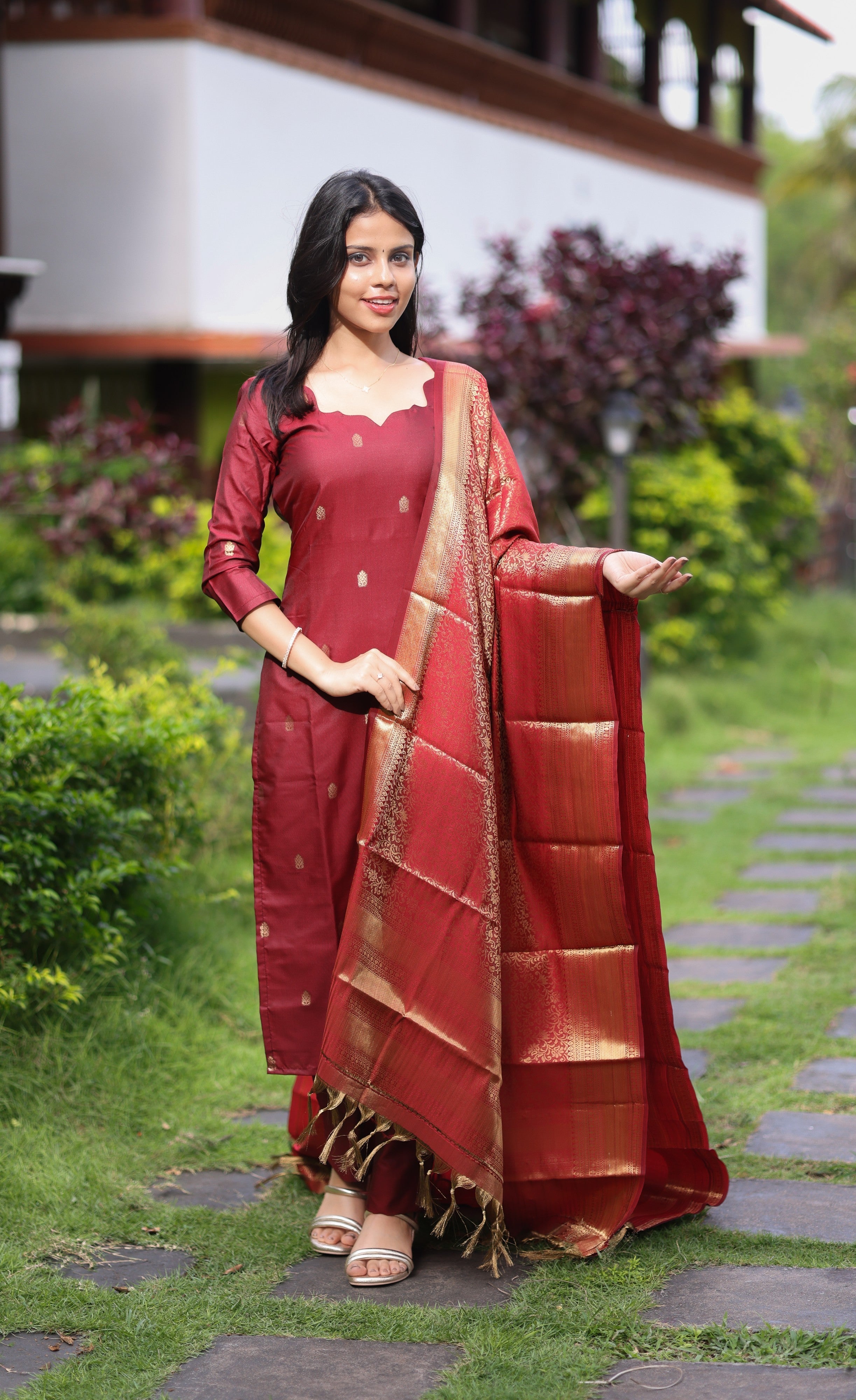 Sanvi - Reddish Maroon and Beige Semi Kanchipuram Silk Salwar Plus Size